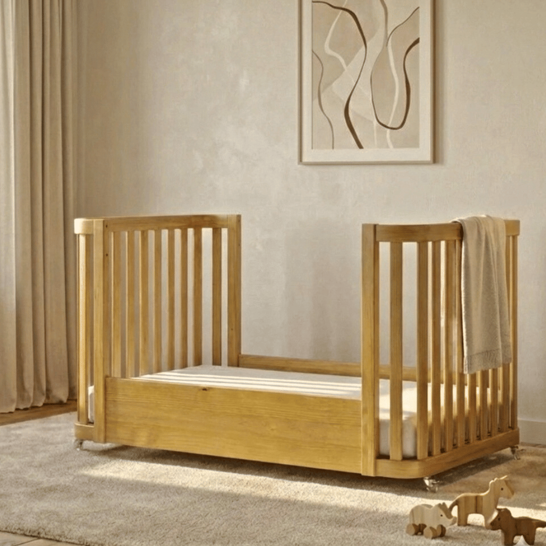Fabricado em madeira maciça, o berço garante resistência e estabilidade, sendo uma opção durável que pode ser aproveitada por muito mais tempo. Seu acabamento em mel realça os veios naturais da madeira, trazendo um toque de sofisticação ao quarto do bebê.