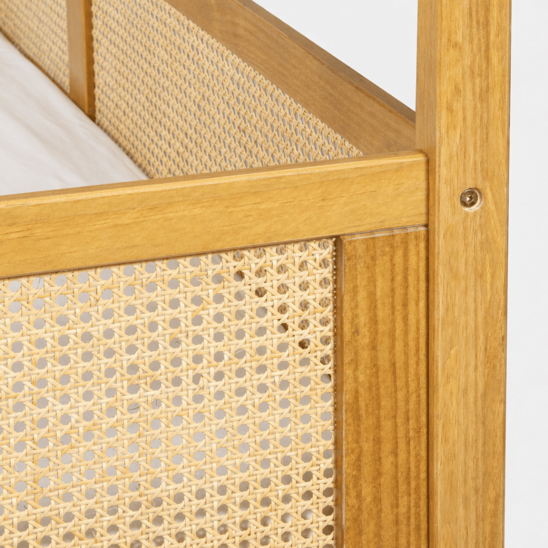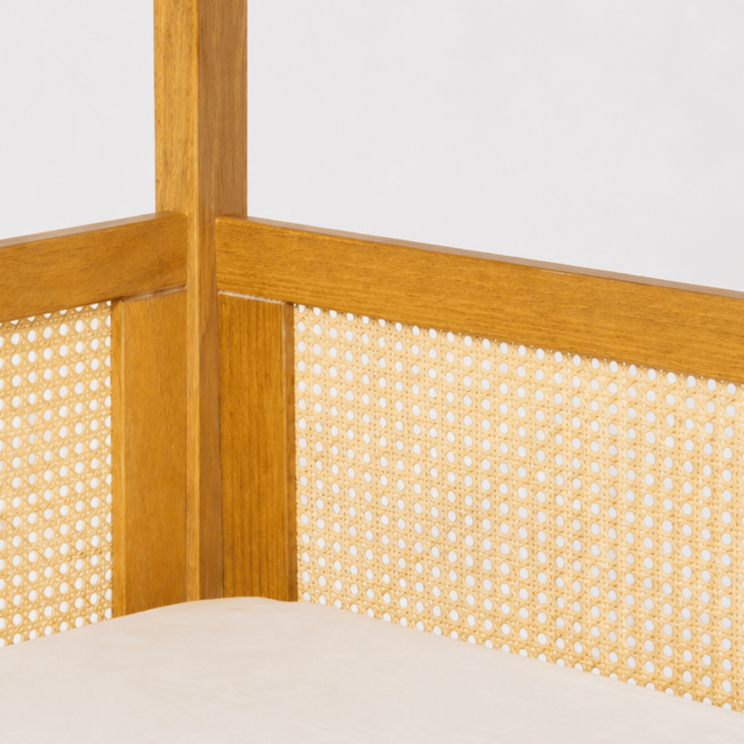 Produzida em madeira maciça de pinus, a cama oferece alta resistência, durabilidade e segurança para o uso diário. O acabamento em tom mel valoriza os veios naturais da madeira, trazendo um visual quente, elegante e acolhedor. Já os detalhes em rattan natural acrescentam um toque artesanal e sofisticado, deixando o móvel ainda mais exclusivo e alinhado às tendências de decoração natural e boho.
