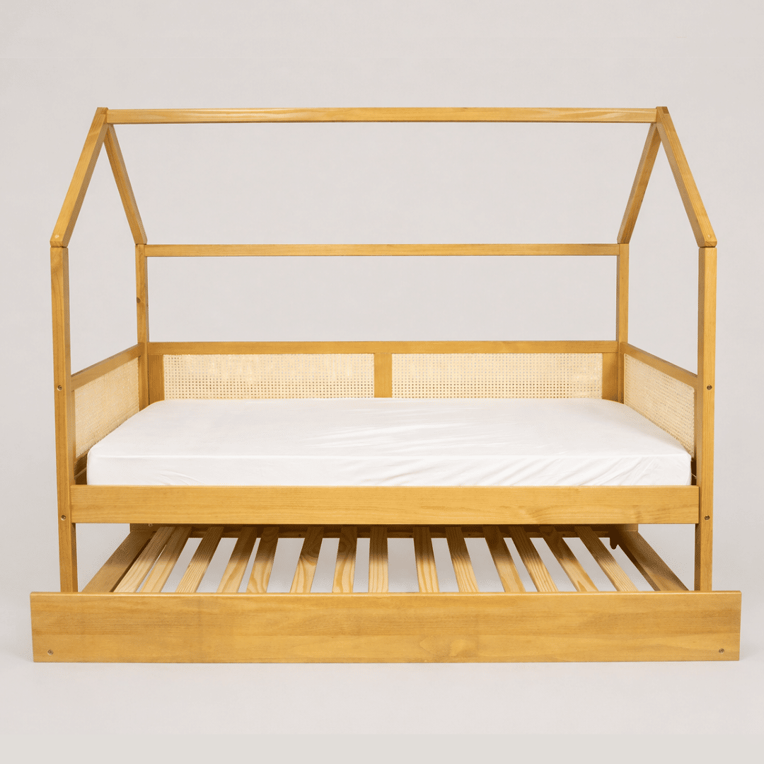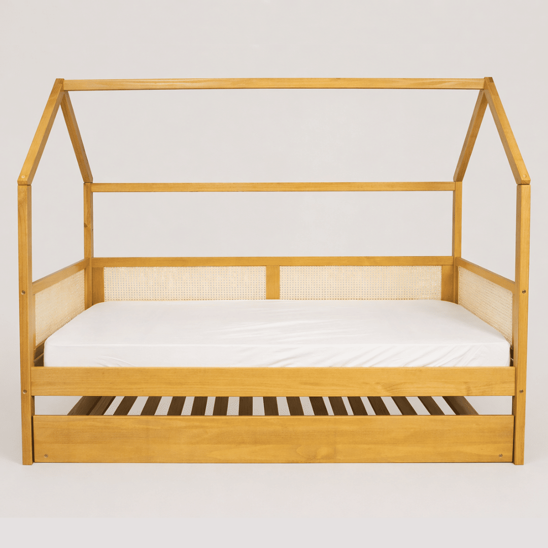 AdicionarTransforme o quarto infantil em um ambiente acolhedor, sofisticado e cheio de imaginação com a Cama Infantil Casinha com Cama Auxiliar Bloomie em Madeira Maciça Pinus Mel com Rattan Natural. Seu design em formato de casinha estimula a criatividade e a autonomia da criança, seguindo os princípios do método montessoriano, enquanto adiciona charme e funcionalidade ao espaço.