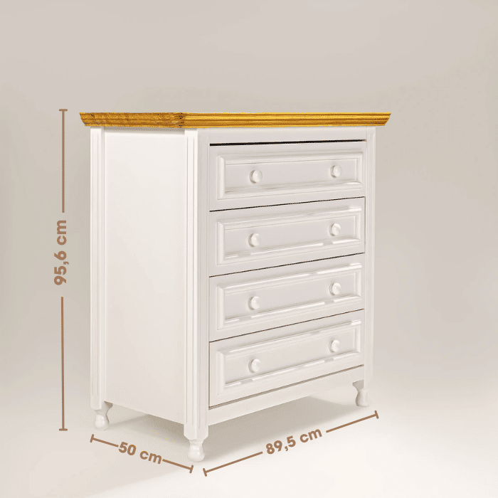 A Cômoda Feliz possui 4 gavetas espaçosas, ideais para armazenar desde roupas e fraldas até brinquedos e acessórios diversos. Seu tampo superior suporta perfeitamente enfeites decorativos, quadrinhos ou trocadores infantis, mantendo a estabilidade necessária para uso diário. As dimensões externas e o peso total encontram-se detalhados na página do produto, garantindo fácil planejamento do espaço conforme sua necessidade.