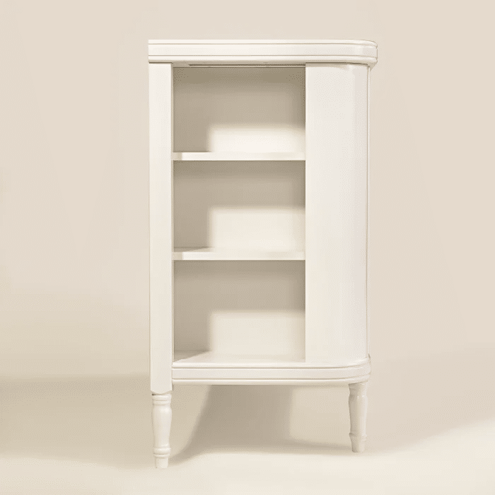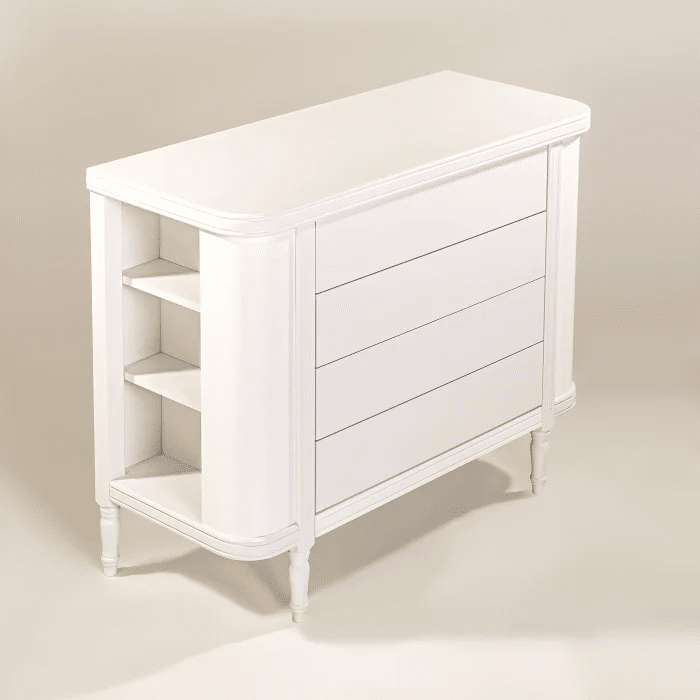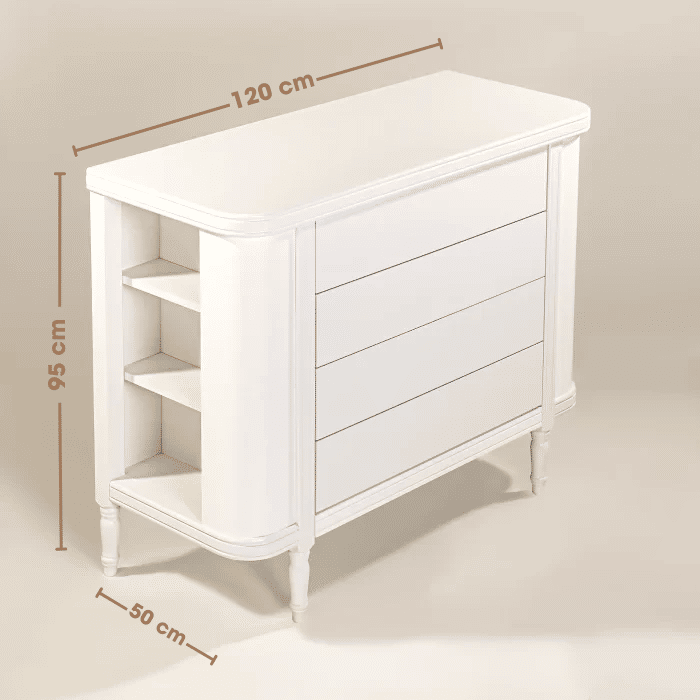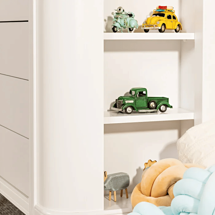 O visual clean da cômoda se destaca pelas linhas suaves e pelos cantos arredondados, que conferem personalidade sem exageros. Os puxadores embutidos mantêm a estética minimalista e evitam projeções que possam prender roupas ou machucar as crianças. A altura foi pensada para facilitar o manuseio pelas próprias crianças, incentivando a autonomia desde cedo. A combinação de gavetas espaçosas com volume compacto garante versatilidade tanto em quartos pequenos quanto em ambientes mais amplos.
