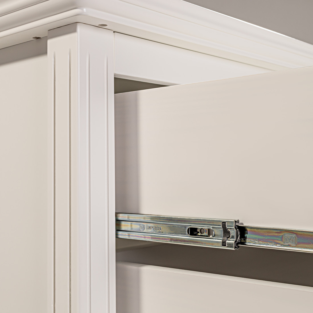 A Cômoda Feliz complementa o kit com quatro gavetas espaçosas e uma porta adornada por tela trançada, perfeita para guardar roupas, acessórios e itens de higiene do bebê com muito charme. Cada gaveta desliza suavemente em corrediças metálicas, proporcionando acesso rápido ao que for mais necessário e mantendo o quarto sempre em ordem.