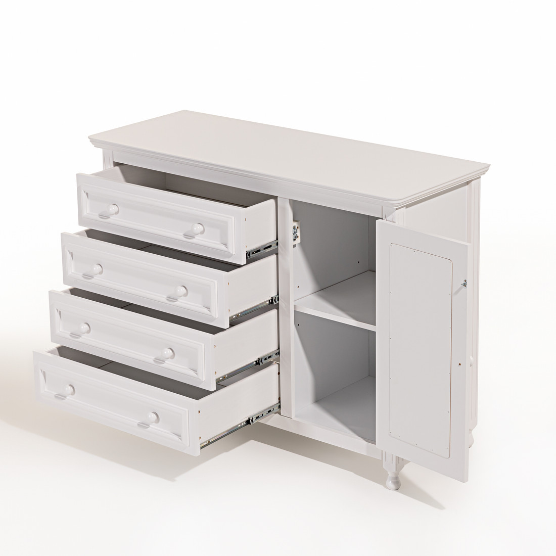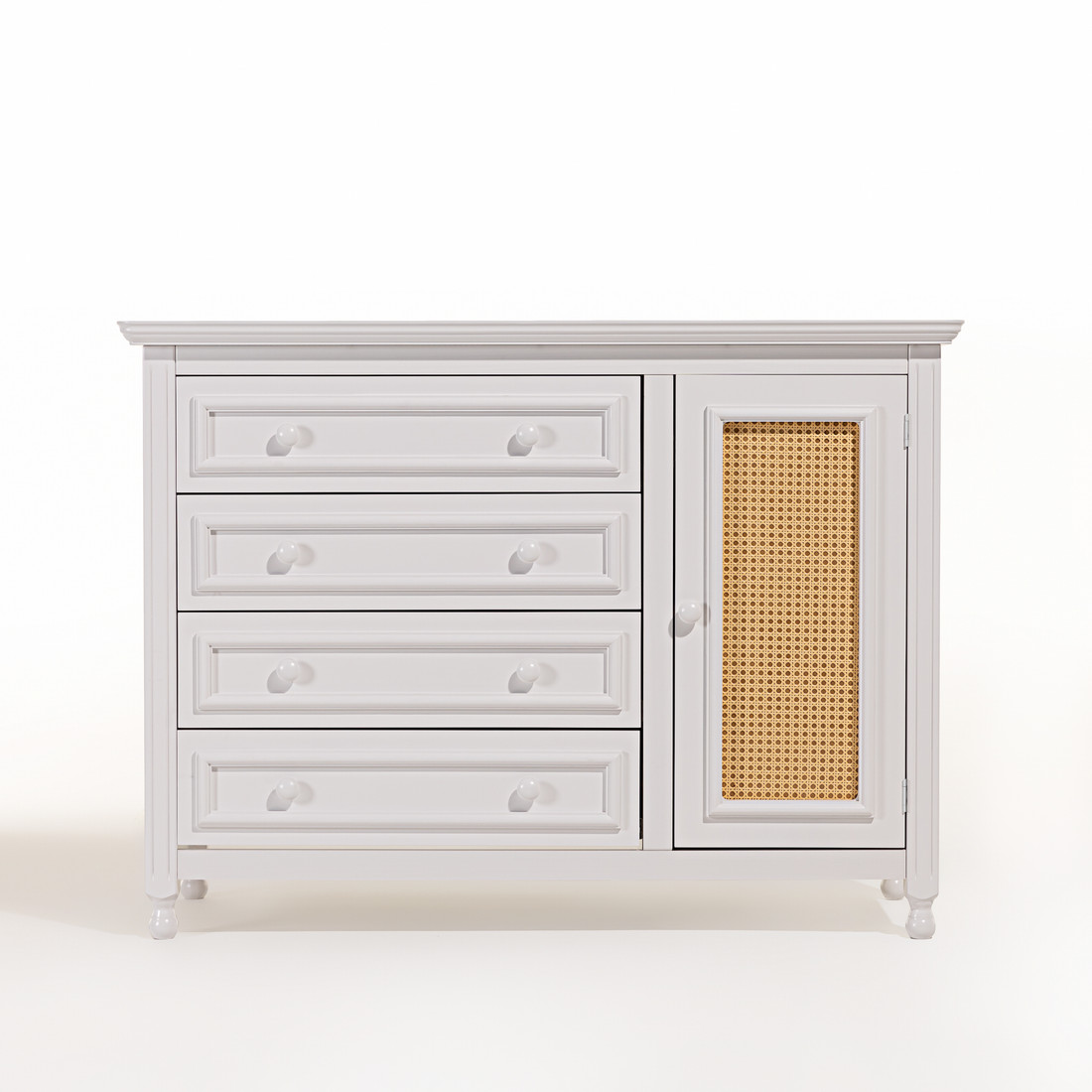 A cômoda Feliz conta com 4 gavetas espaçosas e 1 porta de acesso rápido, ideal para facilitar o dia a dia dos pais, mantendo tudo sempre à mão com elegância e praticidade.