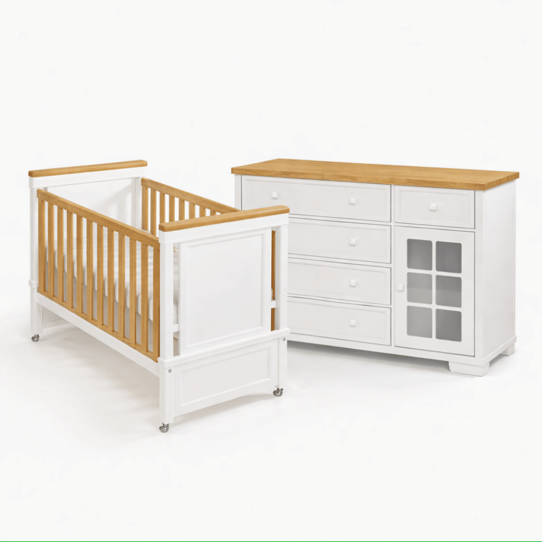 Tanto o berço quanto a cômoda são produzidos em madeira maciça de reflorestamento, garantindo durabilidade e menor empenamento ao longo do tempo. O acabamento em pintura UV atóxica e livre de metais pesados não só proporciona uma superfície lisa e fácil de limpar, mas também atende às normas de segurança para móveis infantis. Todas as bordas são suavemente chanfradas para evitar quinas vivas e reduzir riscos de acidentes com as crianças.