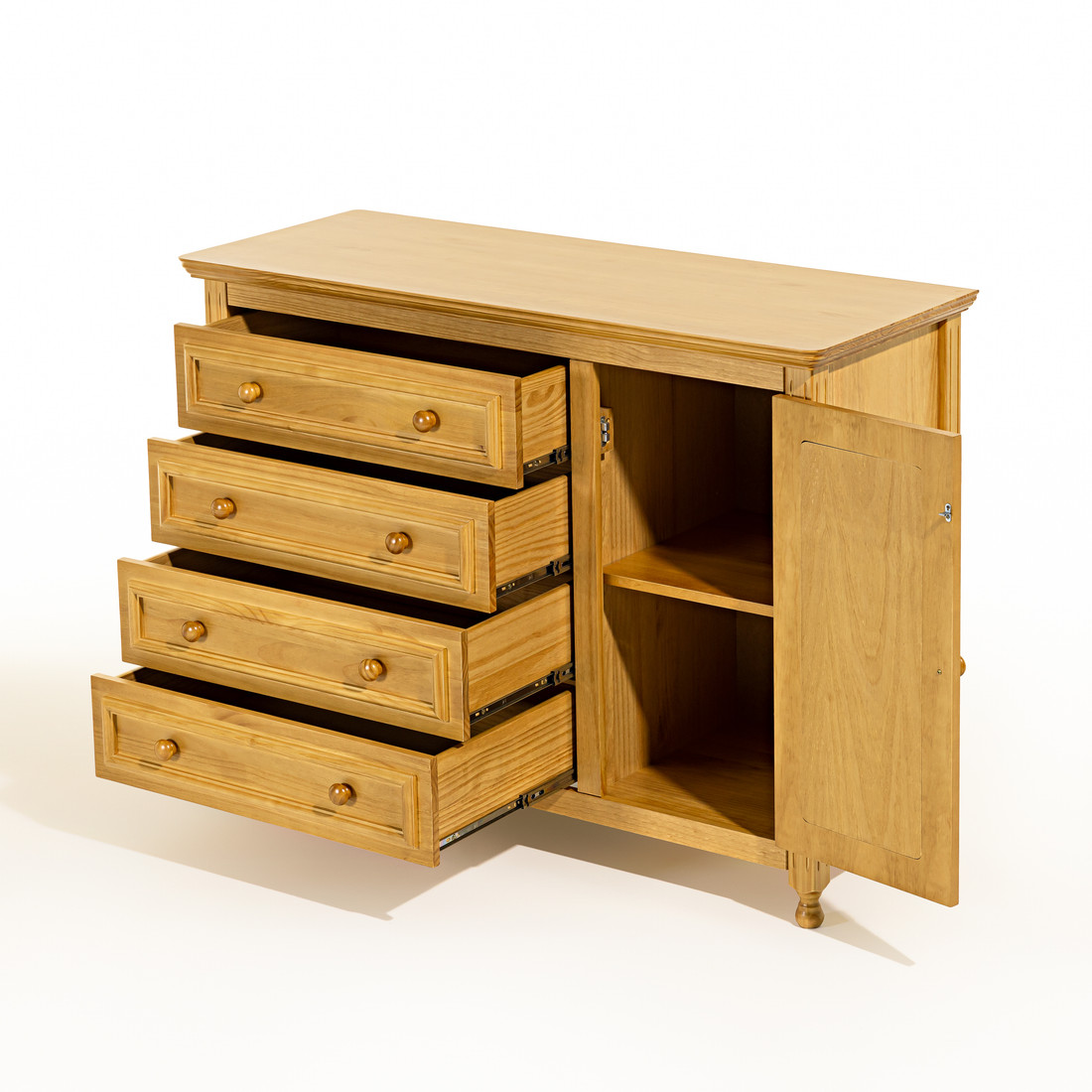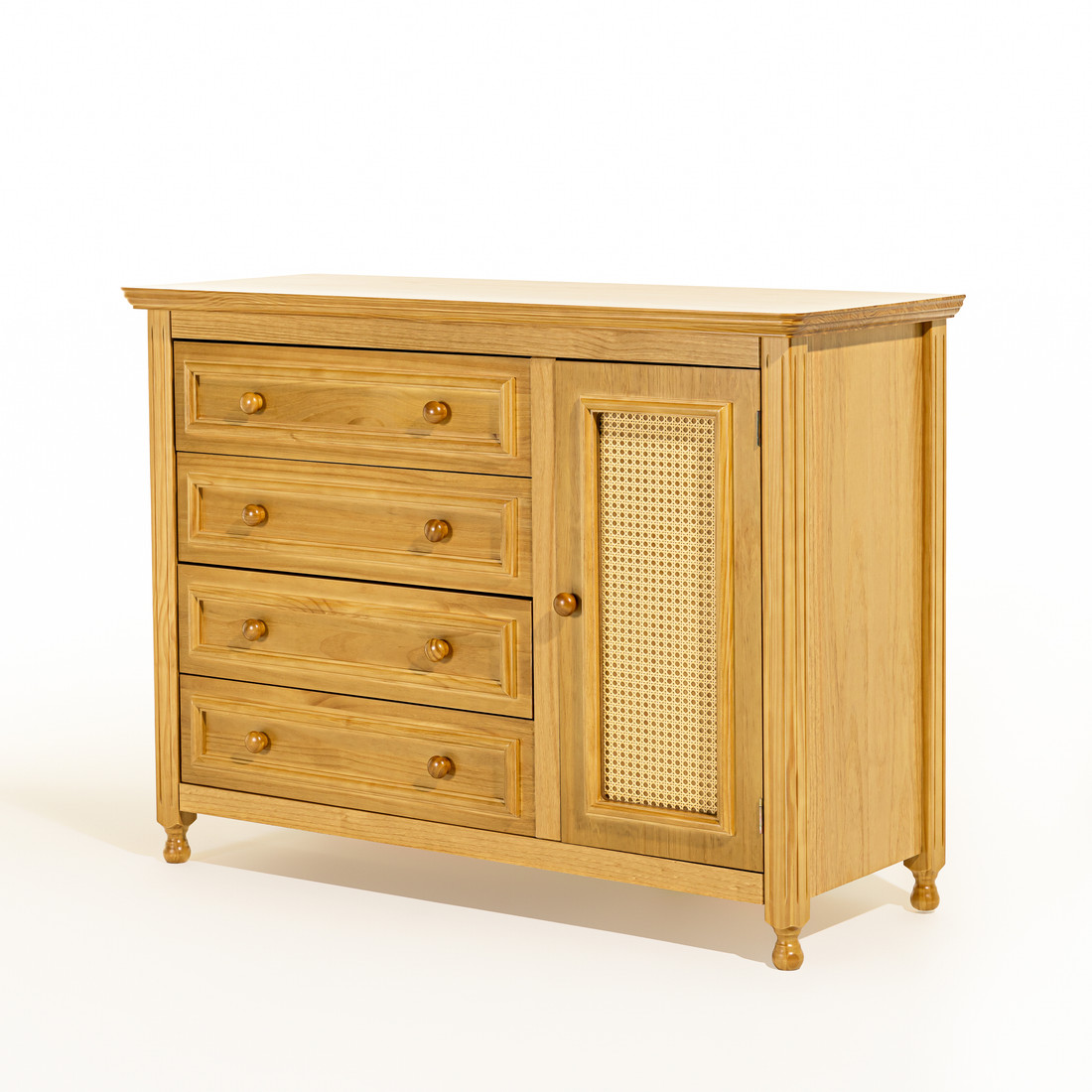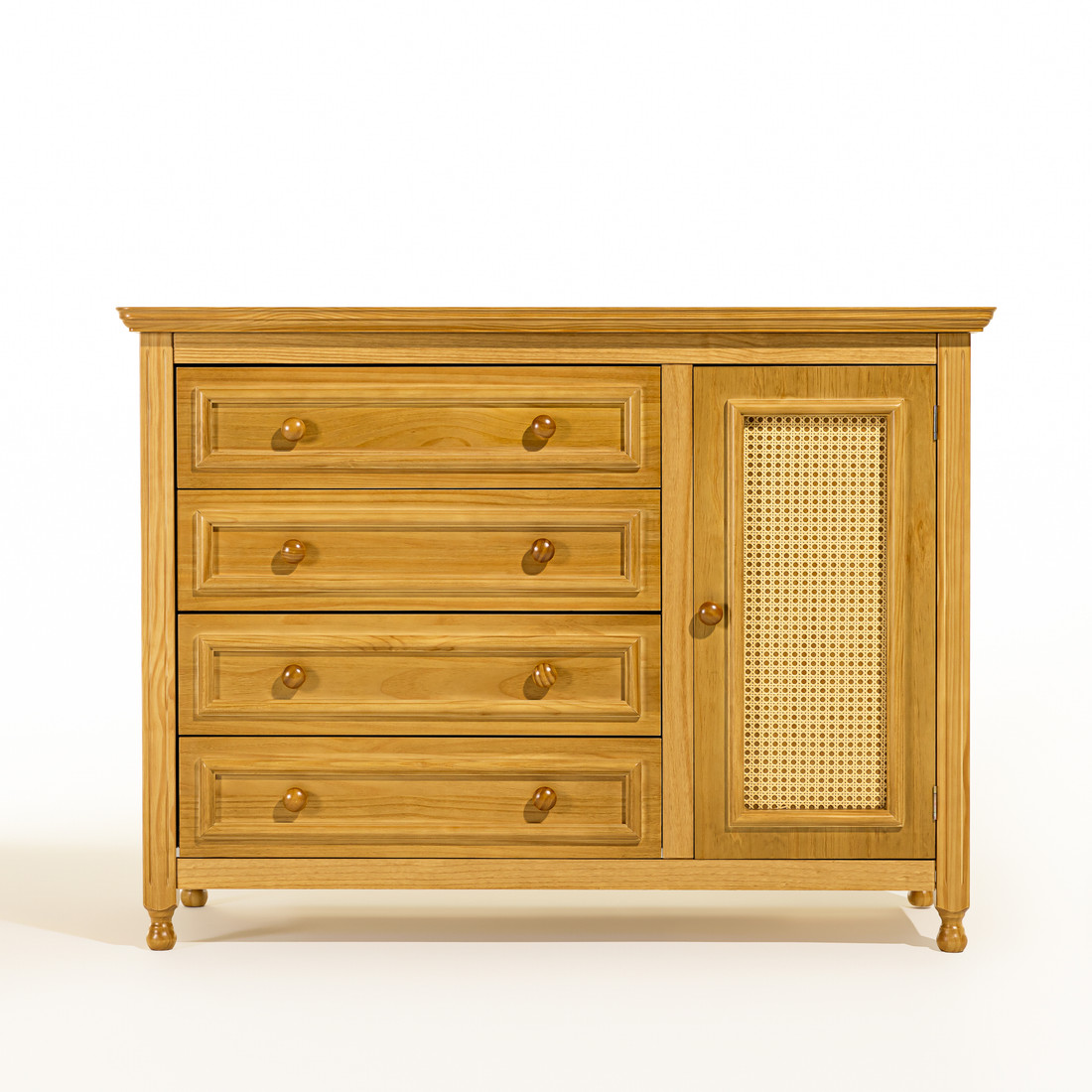 A cômoda Feliz conta com 4 gavetas espaçosas e 1 porta de acesso rápido, ideal para facilitar o dia a dia dos pais, mantendo tudo sempre à mão com elegância e praticidade.