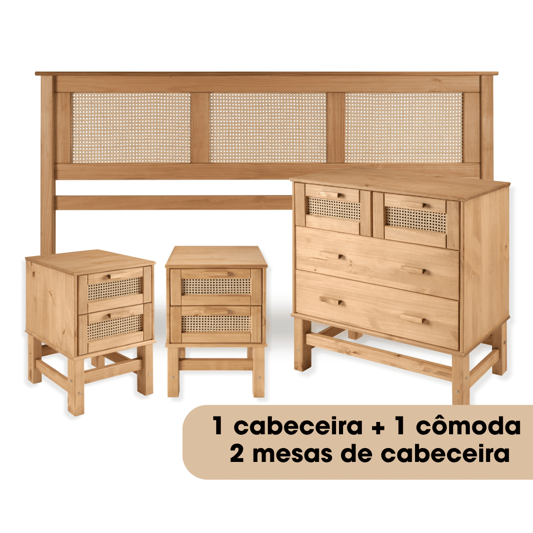 AdicionarTransforme seu quarto em um verdadeiro refúgio de estilo e sofisticação com o nosso kit exclusivo, composto pela Cabeceira de Cama KING em madeira e rattan, pela Mesa de Cabeceira Rattan e pela majestosa Cômoda em Madeira e Rattan de 04 gavetas. Cada peça foi cuidadosamente projetada para agregar charme natural e elegância ao seu ambiente, criando uma atmosfera tranquila e cheia de personalidade. A Cabeceira de Cama, com seu design artesanal e contemporâneo, é a peça central perfeita para um quarto que exala requinte. O acabamento em rattan traz um toque de frescor e leveza. Acompanha a Cabeceira KING, a Mesa de Cabeceira Rattan, que combina praticidade e beleza. Com uma gaveta e um nicho adicional, oferece espaço suficiente para organizar seus itens essenciais, mantendo o ambiente sempre funcional e elegante. Para completar o ambiente, a Cômoda em Madeira e Rattan de 04 gavetas é a peça perfeita para revitalizar seu quarto. Seus detalhes em rattan adicionam uma dose de elegância e sofisticação a esta obra-prima artesanal. Com amplas gavetas, ela oferece excelente capacidade de armazenamento, sem abrir mão do estilo refinado que sua decoração merece.