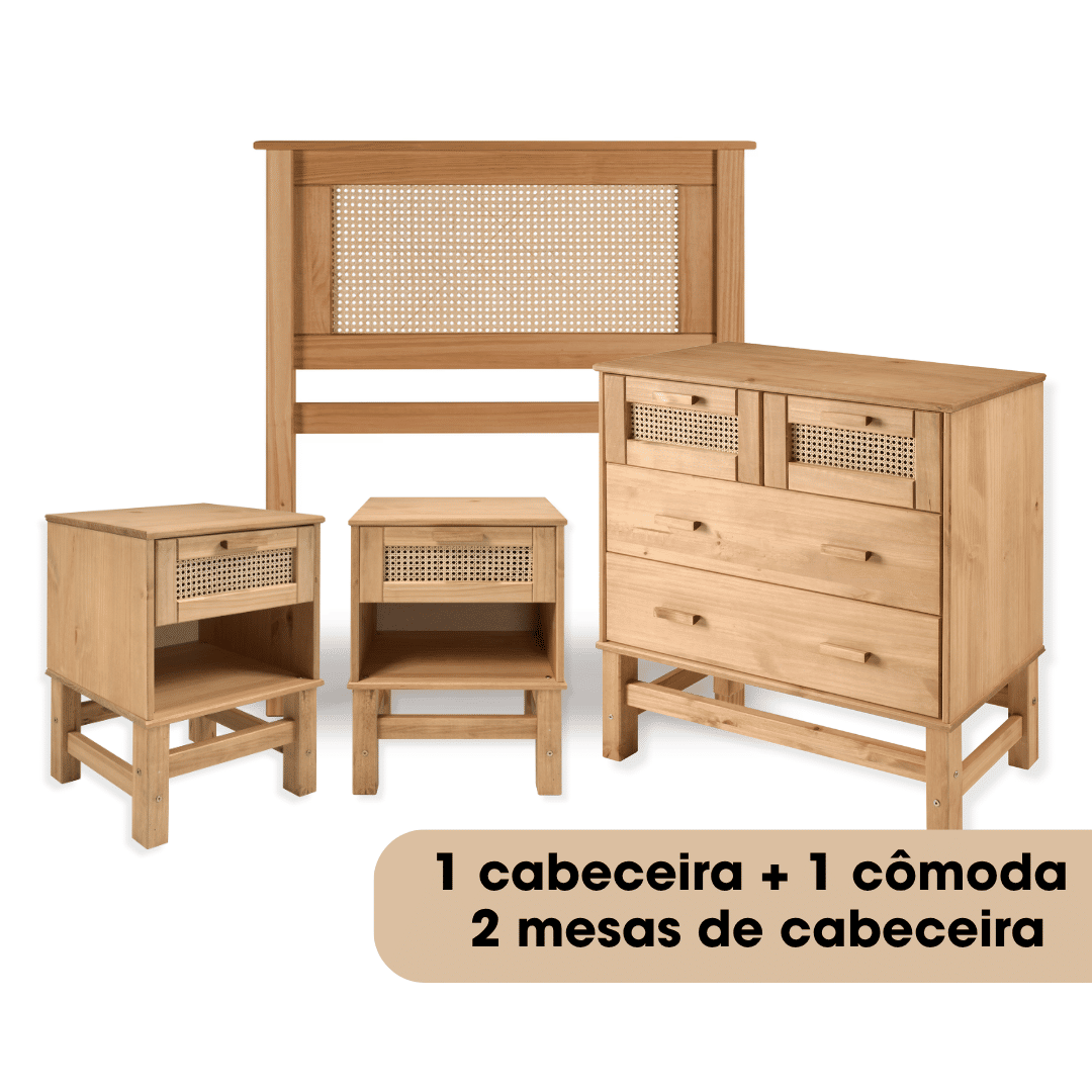 Produzido de madeira maciça de Pinus, com acabamento em Rattan.