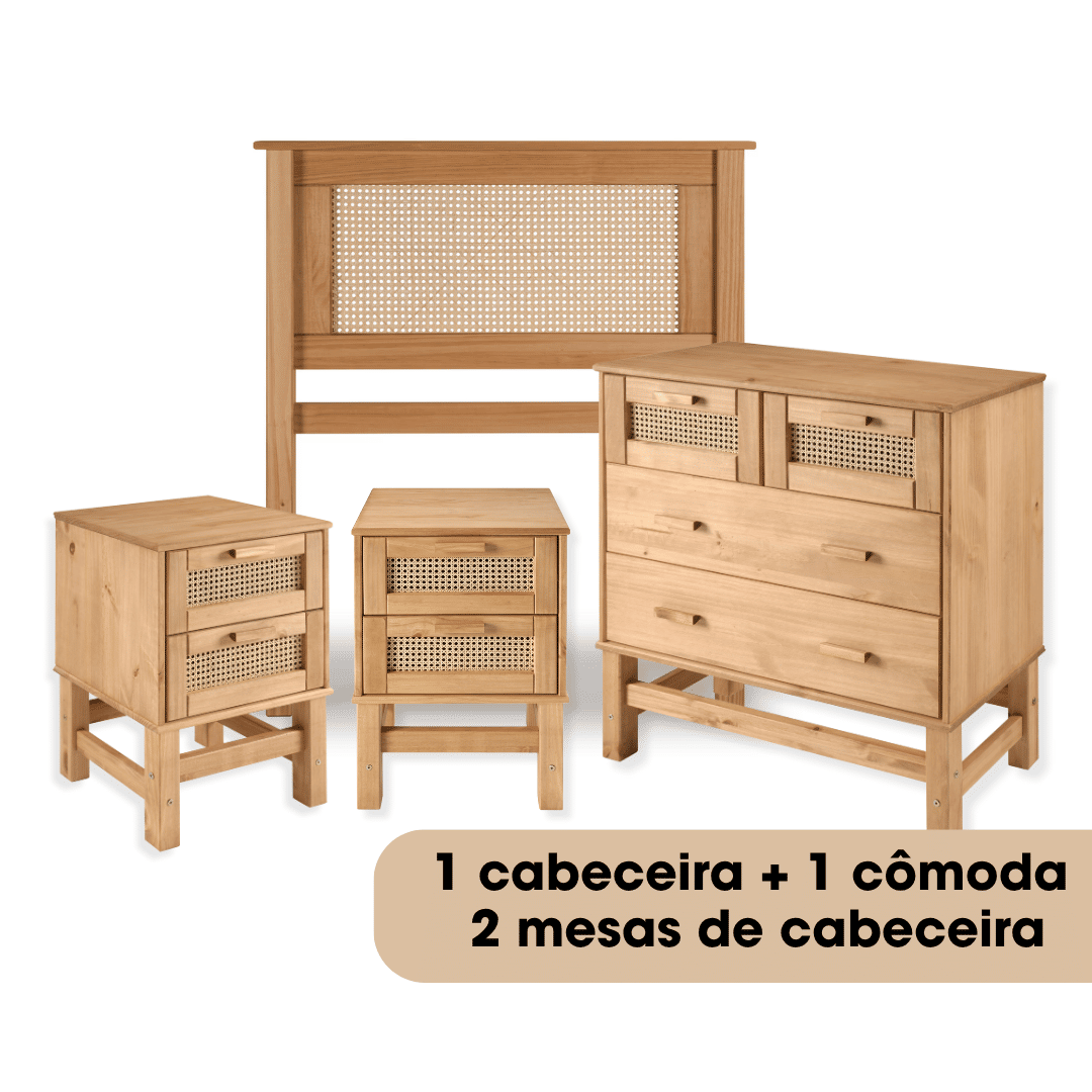Produzido de madeira maciça de Pinus, com acabamento em Rattan.