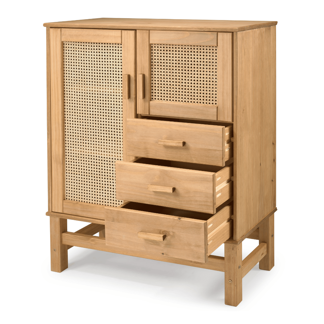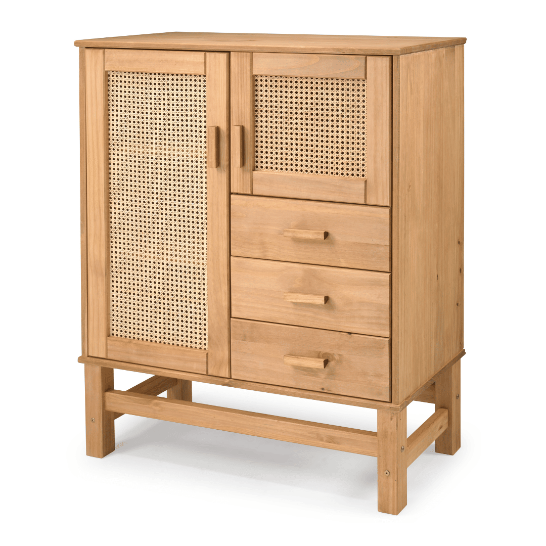 Este móvel é confeccionado em madeira maciça de Pinus e apresenta um estilo rústico, com características naturais que tornam cada peça única. É comum a presença de nós, veios aparentes, variações de tonalidade e pequenas diferenças nas emendas e junções, elementos que ressaltam a autenticidade da madeira e conferem charme ao ambiente. As variações de cor fazem parte da natureza da madeira e contribuem para a exclusividade de cada produto. Pequenos espaços entre gavetas — de alguns milímetros — são esperados e fazem parte da proposta rústica, além de garantirem o bom funcionamento de portas e gavetas com o passar do tempo.