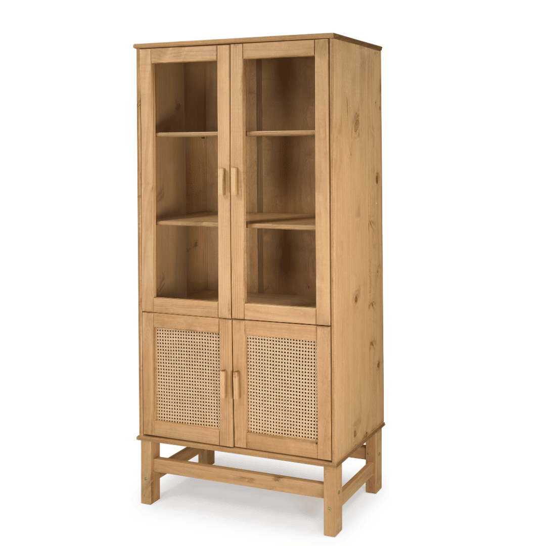 Produzido de madeira maciça de Pinus, com acabamento em Rattan.
